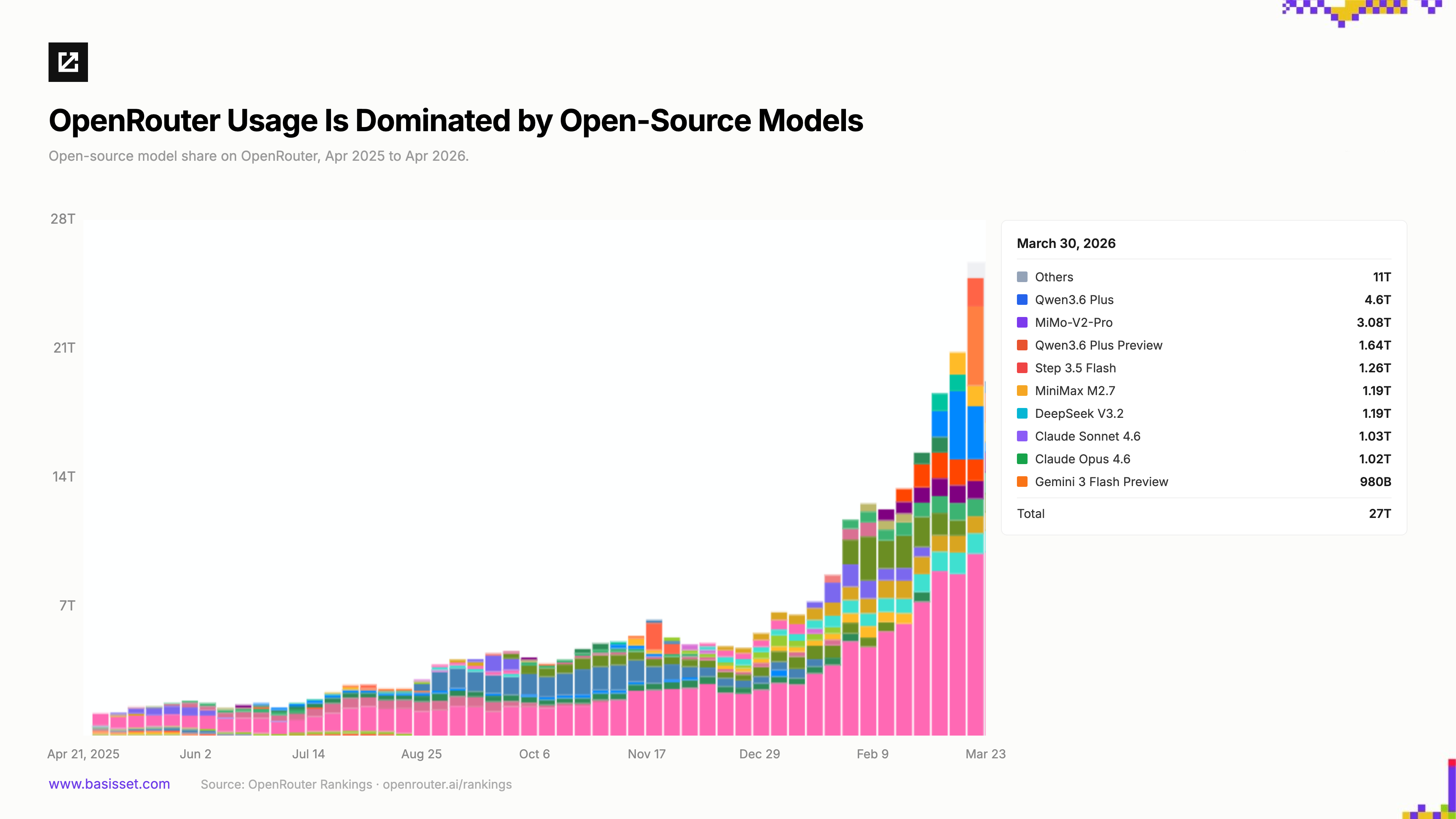 Open-source models are capturing real usage. One public proxy for production model usage is OpenRouter, which routes tokens across models and providers for developers and agent harnesses worldwide. It captures only a fraction of the total ecosystem, but likely the fraction most open to switching models. Its leaderboards tell a striking story: total throughput has grown roughly 5x over the past three months to 27 trillion tokens in a single week in March, and roughly 70% of volume today goes to open-source models. This is a structural recomposition of where inference happens.