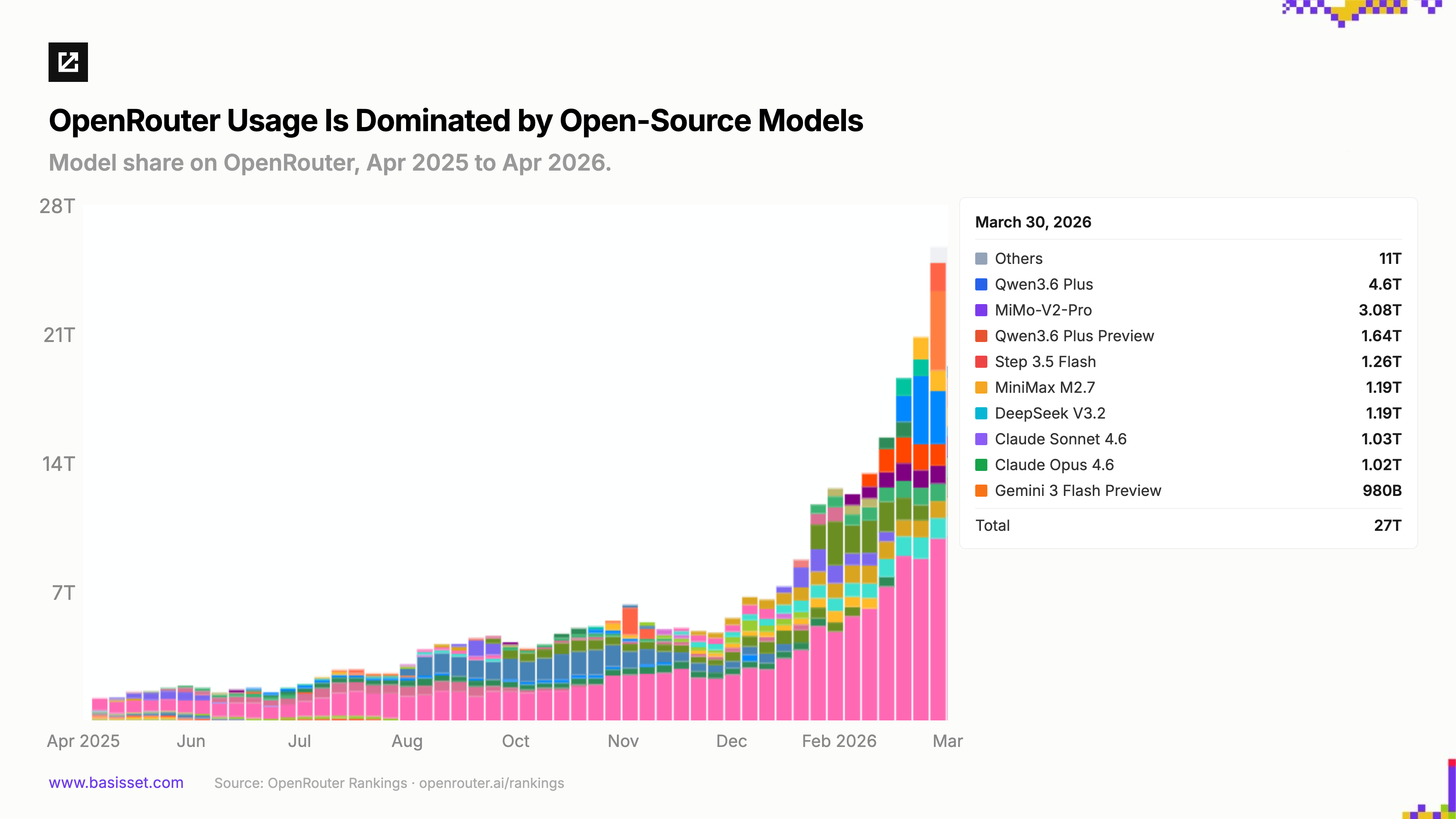 Open-source models are capturing real usage. One public proxy for production model usage is OpenRouter, which routes tokens across models and providers for developers and agent harnesses worldwide. It captures only a fraction of the total ecosystem, but likely the fraction most open to switching models. Its leaderboards tell a striking story: total throughput has grown roughly 5x over the past three months to 27 trillion tokens in a single week in March, and roughly 70% of volume today goes to open-source models. This is a structural recomposition of where inference happens.