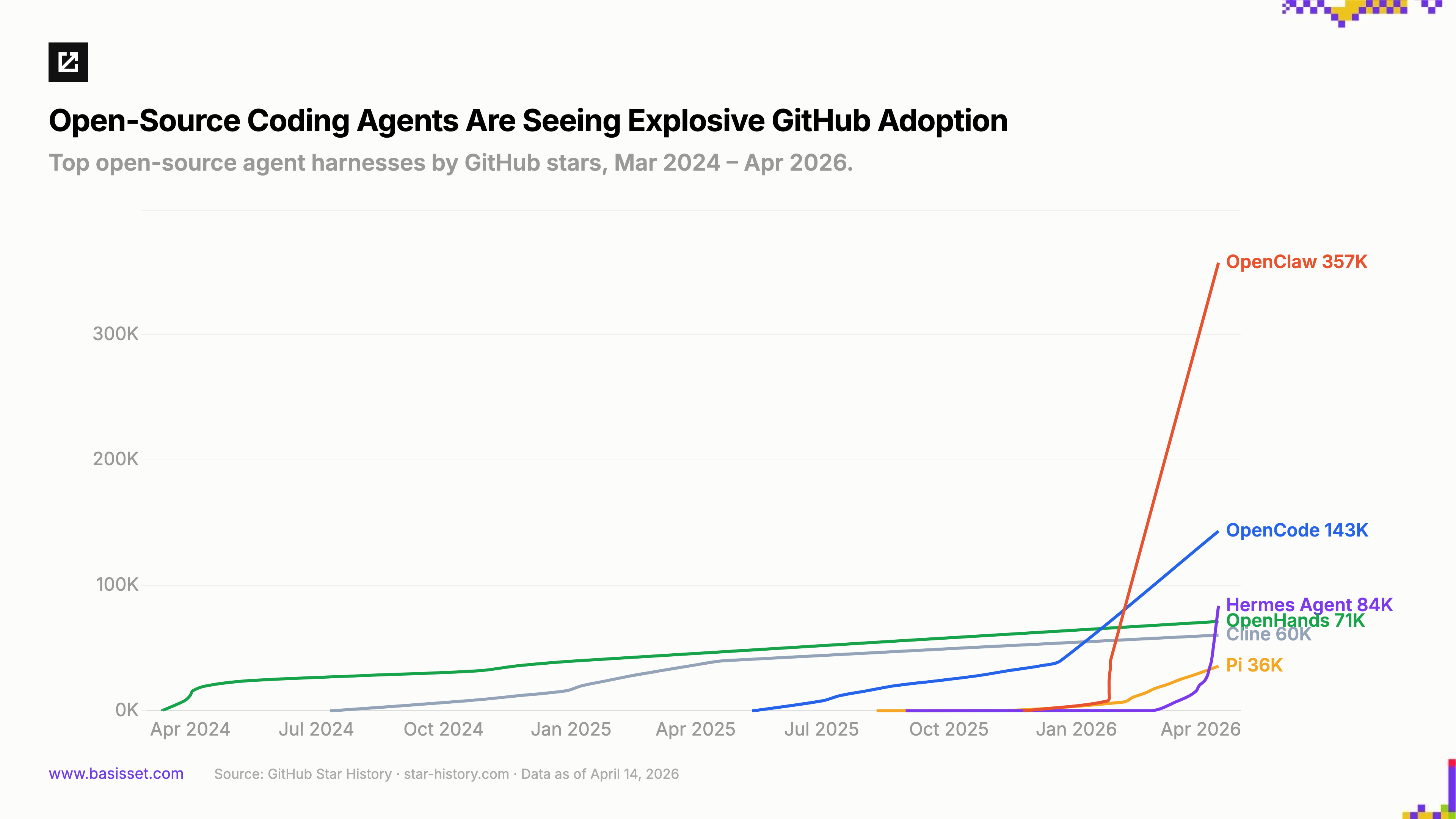 The early entrants proved the model: OpenHands (71K stars, 464 contributors) and Cline (60K stars, 3.5M VS Code installs) showed community-driven coding agents could attract serious adoption. OpenCode (143K stars) raised the bar on customization, giving developers full control over system prompts and agent behaviors, and built a formidable marketing presence on X that accelerated its distribution.