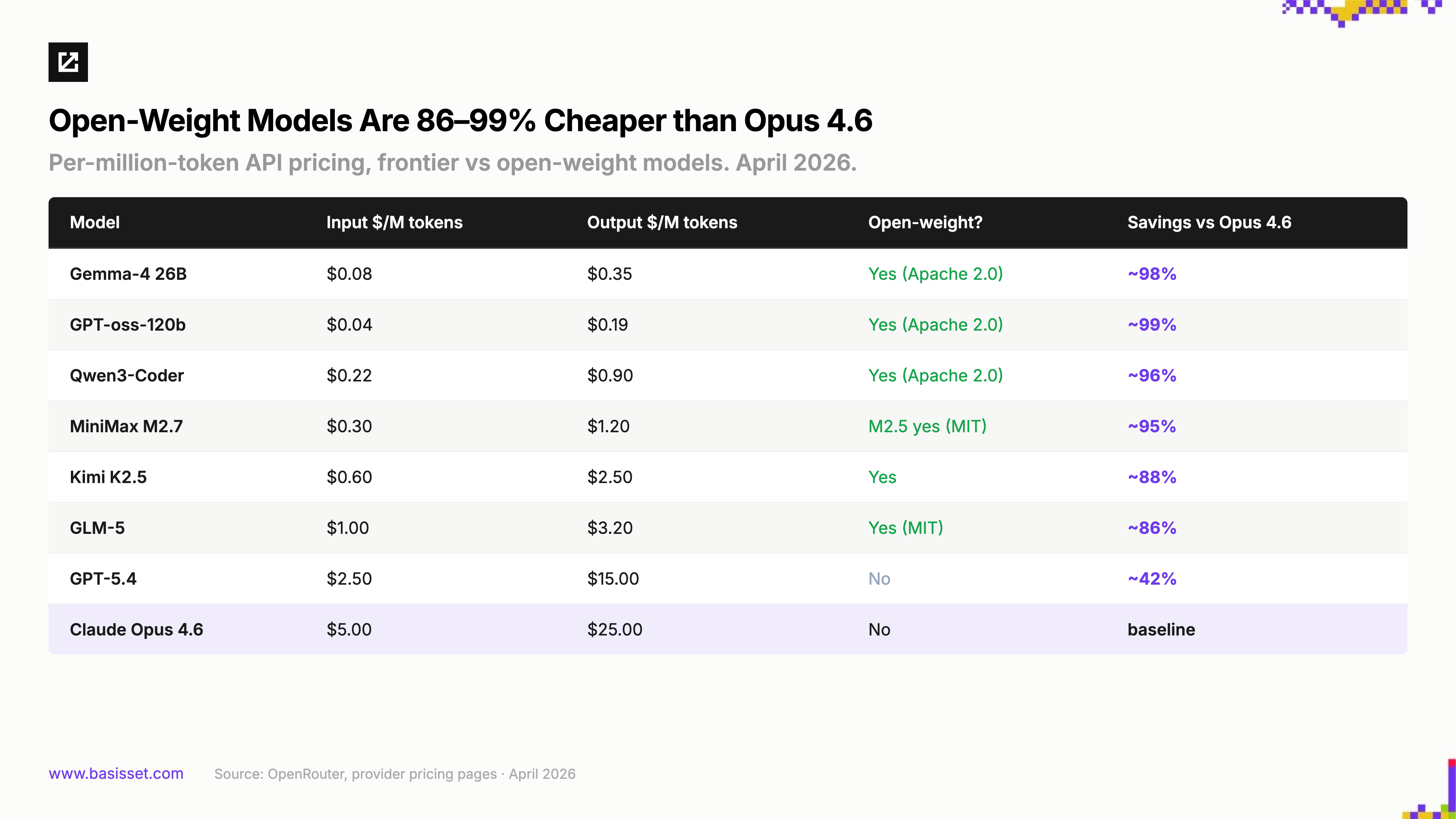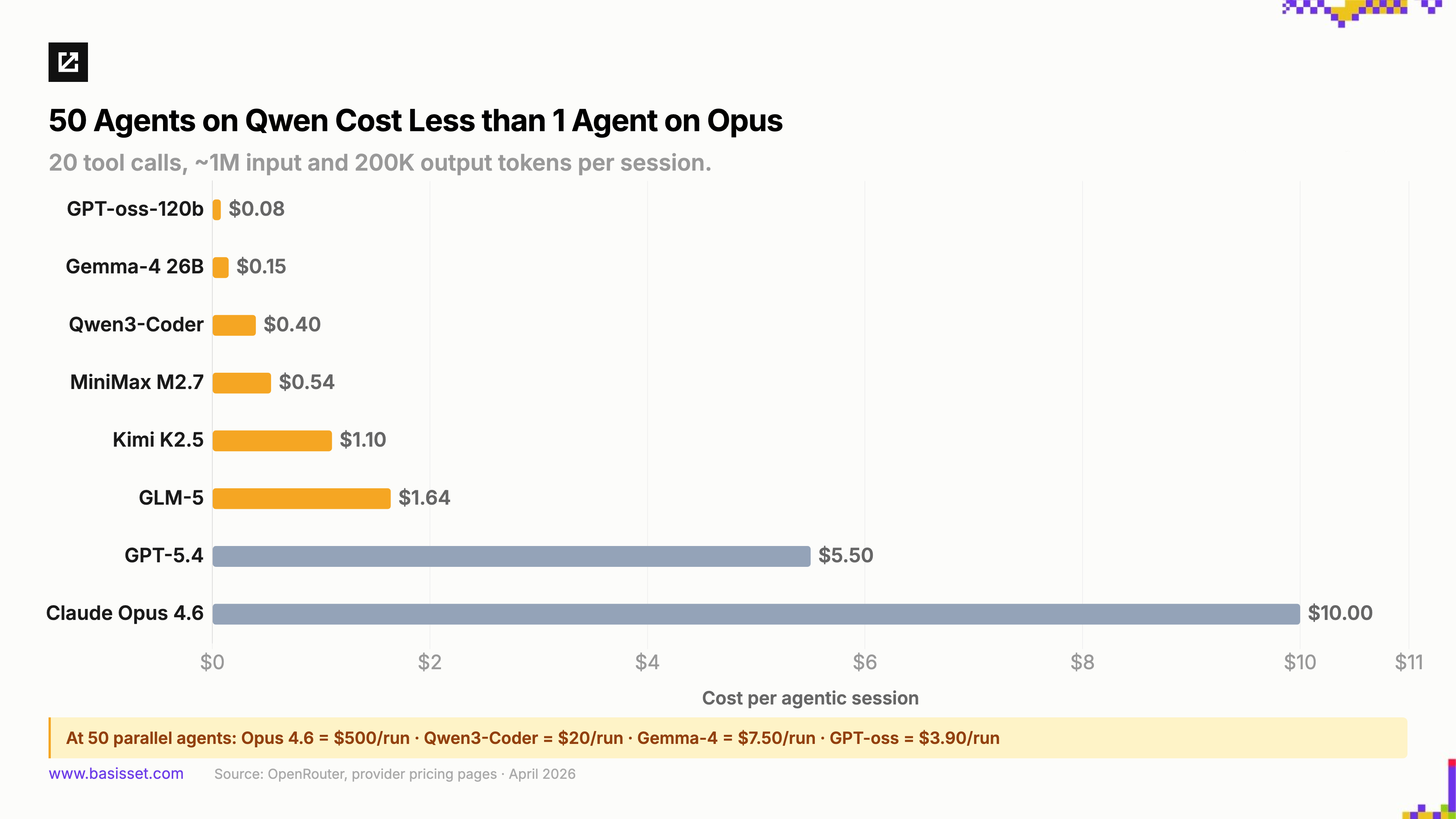 Run the math on a typical agentic session and the gap is 10-25x. Now multiply by fifty parallel agents running speculative execution paths, redundant verification loops, and always-on background tasks. The teams building those architectures are running open models, not because they want to, but because they could not afford frontier pricing at that scale. The smaller versions of many of these models can run locally for free if they fit on your hardware.